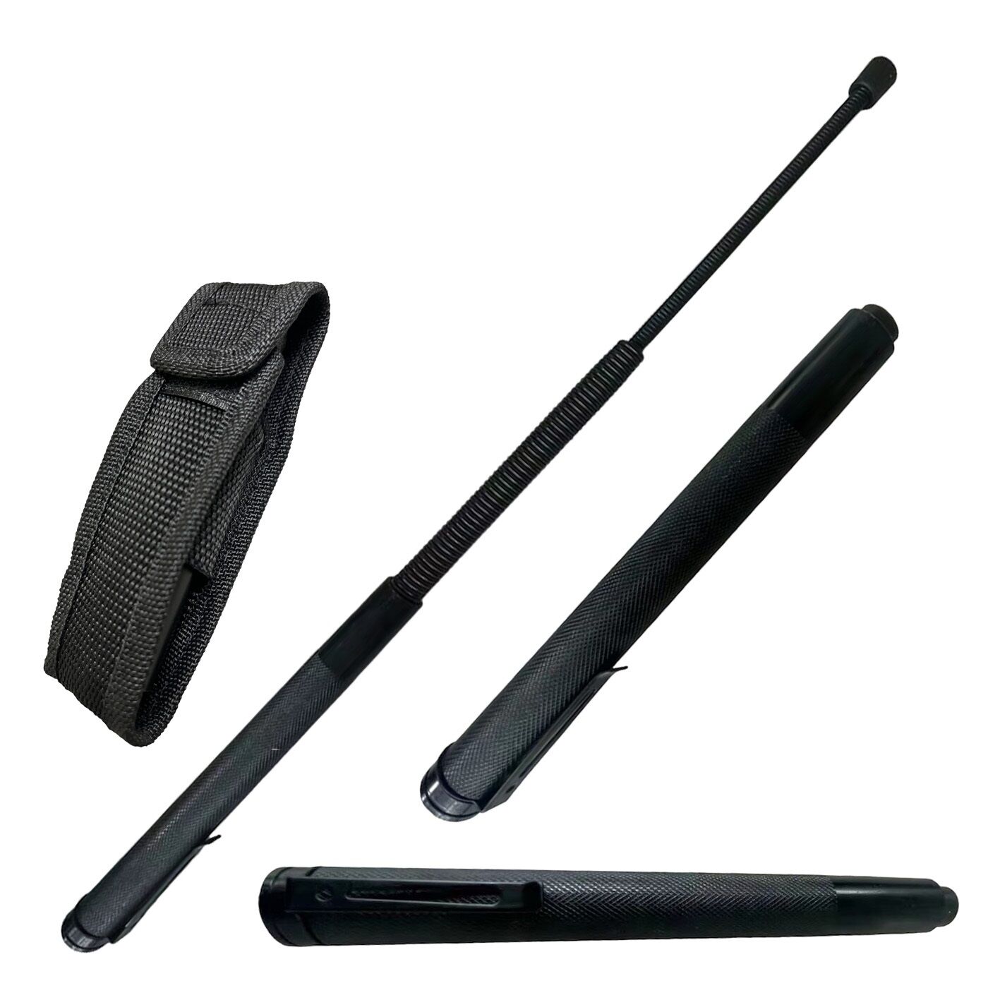 This solid steel baton is the perfect self-defense weapon for anyone since it is only 8.25” long closed, making it easy to carry in a purse or pocket. When needed, a simple flick of the wrist extends the baton to its full 21” length. What sets this baton apart from others is that the main body parts are actually spring coils. These springs will create a whipping effect when being swung allowing the baton to build momentum and increase striking power to fend off attackers. On top of that, it has a textured handle that provides a no-slip grip. It also has a built-in pocket clip and includes a nylon holster with a belt loop for handsfree carrying options.