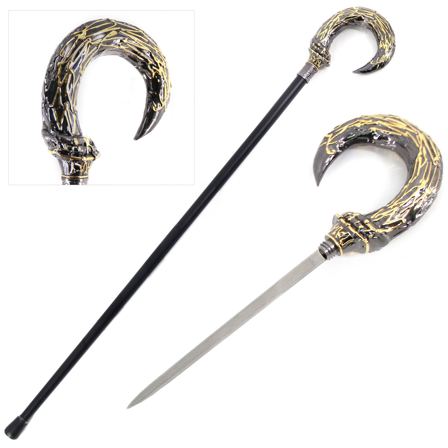 The black and gold accents curved harpy sword cane captures the essence of striking lines in faceted metal. Its hook-shaped handle combines aesthetics and solidity with details that emulate textures of nature, resulting in a piece that staddles the line between classic and mystical. It is an instrument of presence and a manifesto of style and visual gear. This dual-purpose cane can double as a sword for self-defense. The metal walking stick is incredibly sleek and well designed, and it only gets better when you reveal the short blade within. A rubber toe makes this a functional cane for getting around.. This sword cane is perfect for cosplay, decoration, and collections!