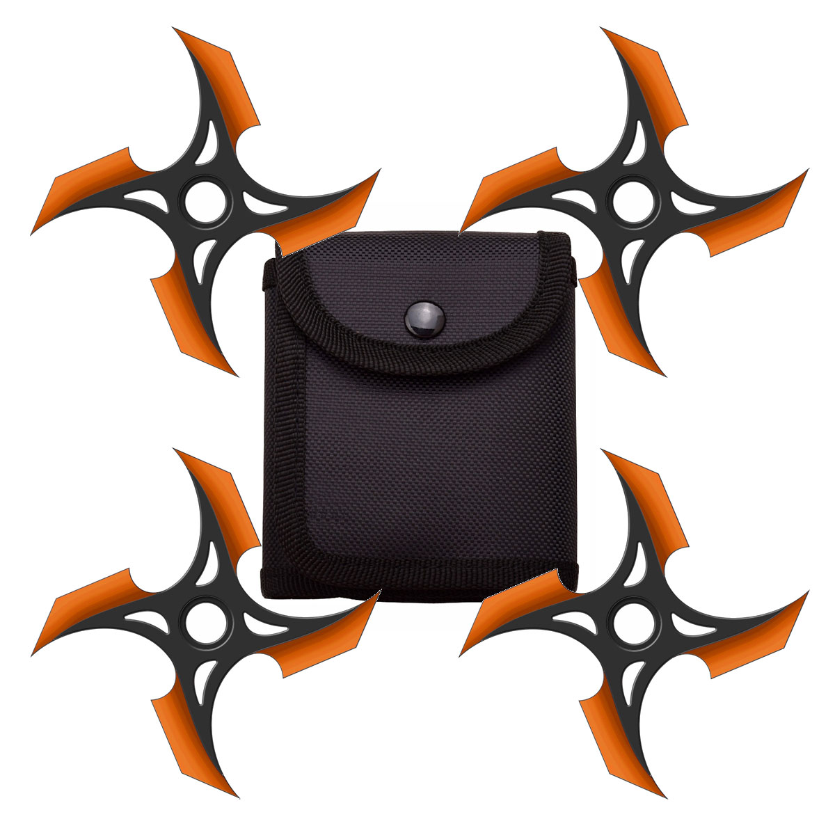 The incredible four point Black and Orange Finish Shuriken throwing star is made from heavy, high grade stainless steel. This ninja star is forged and sharpened to have greater mass and supreme balance. This allows the four point shiruken to stick to targets in a deadlier fashion than smaller or lighter throwing stars.