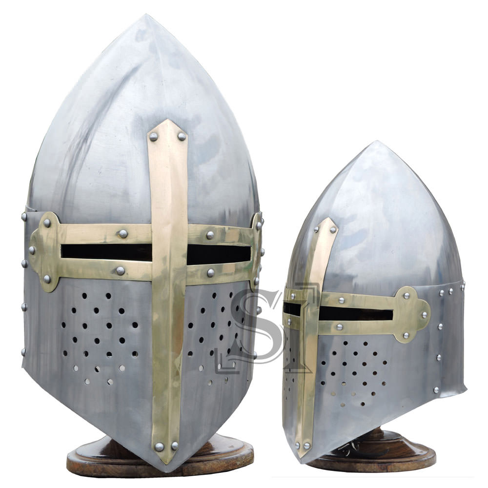 Sugarloaf helmet is variation of top helm with sphero-conical dome. It was popular in Europe in the first part of XIV century. This helm is made from 16g steel with real brass accents. The lower portion of the helmet consists of two parts that are riveted to the dome. The brass accents form a cross that attaches to the front with eye slits. The front features several holes for ventilation. Inside a leather suspension liner is provided for comfort and includes an adjustable chin strap with steel buckle. A steel loop is also provided to hold the extra leather tight from the adjustable chin strap. The sugarloaf helmet is easy-to-use and provides with perfect protection during medieval fencing. Comes with the wooden display stand.