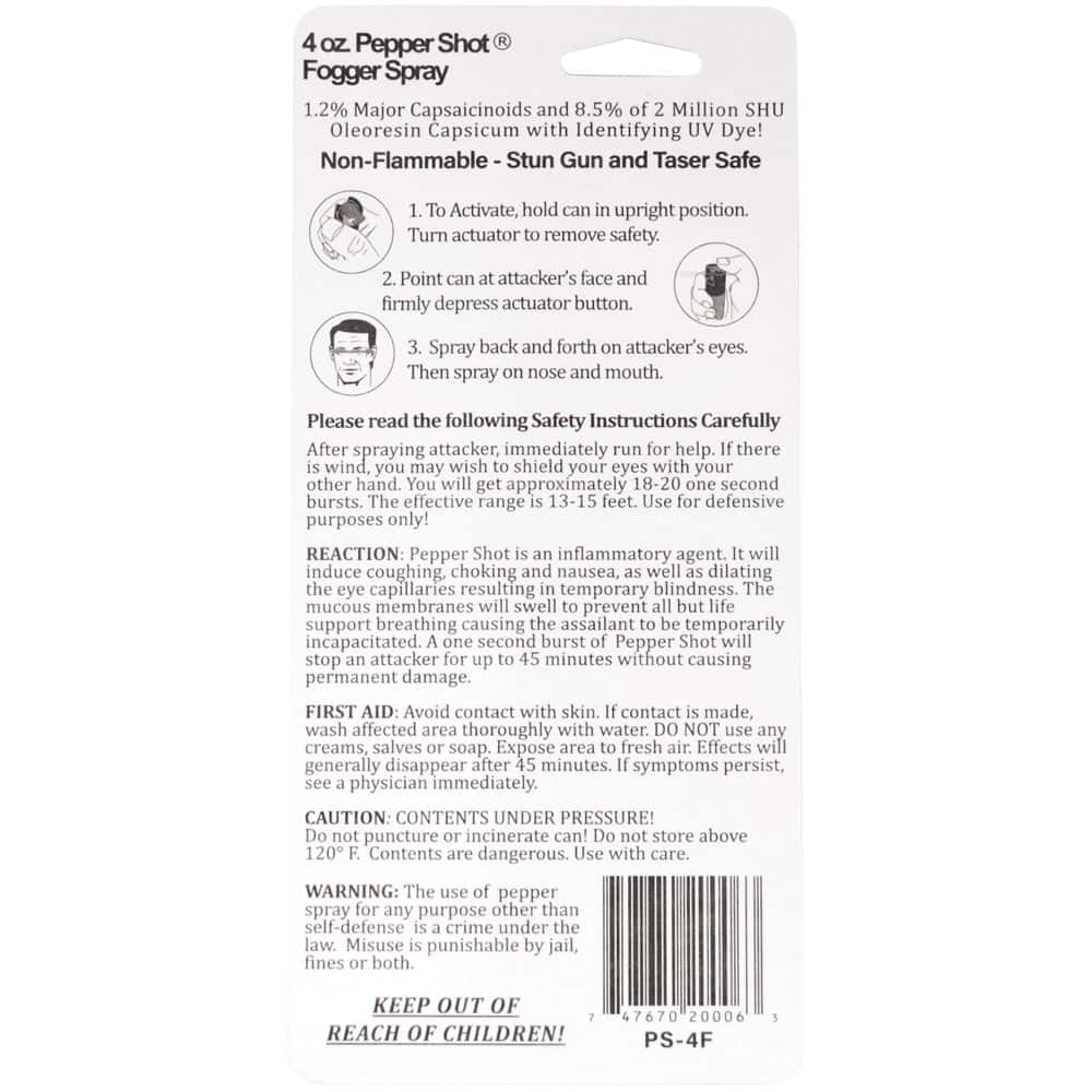 Pepper Shot 1.2% MC 4 oz pepper spray. Pepper Shot Pepper Spray is made with 1.2% Major Capsaicinoids. The Major Capsaicinoids are the true heat measure and Pepper Shot 1.2% MC is more effective than of most other pepper sprays. In addition to causing an attacker pain, The Pepper Shot 8.5% oleoresin capsicum formula swells the mucous membranes, which makes breathing difficult, and swells the veins in the eyes, causing the eyes to close. It’s made from 2,000,000 SHU’s of raw pepper and these effects can last up to 45 minutes and cause no permanent damage. Has a UV identifying dye to help aid in the identification of an attacker. Our 4 oz Pepper Shot is perfect for home use or carrying on your belt with the leatherette holster with belt clip.