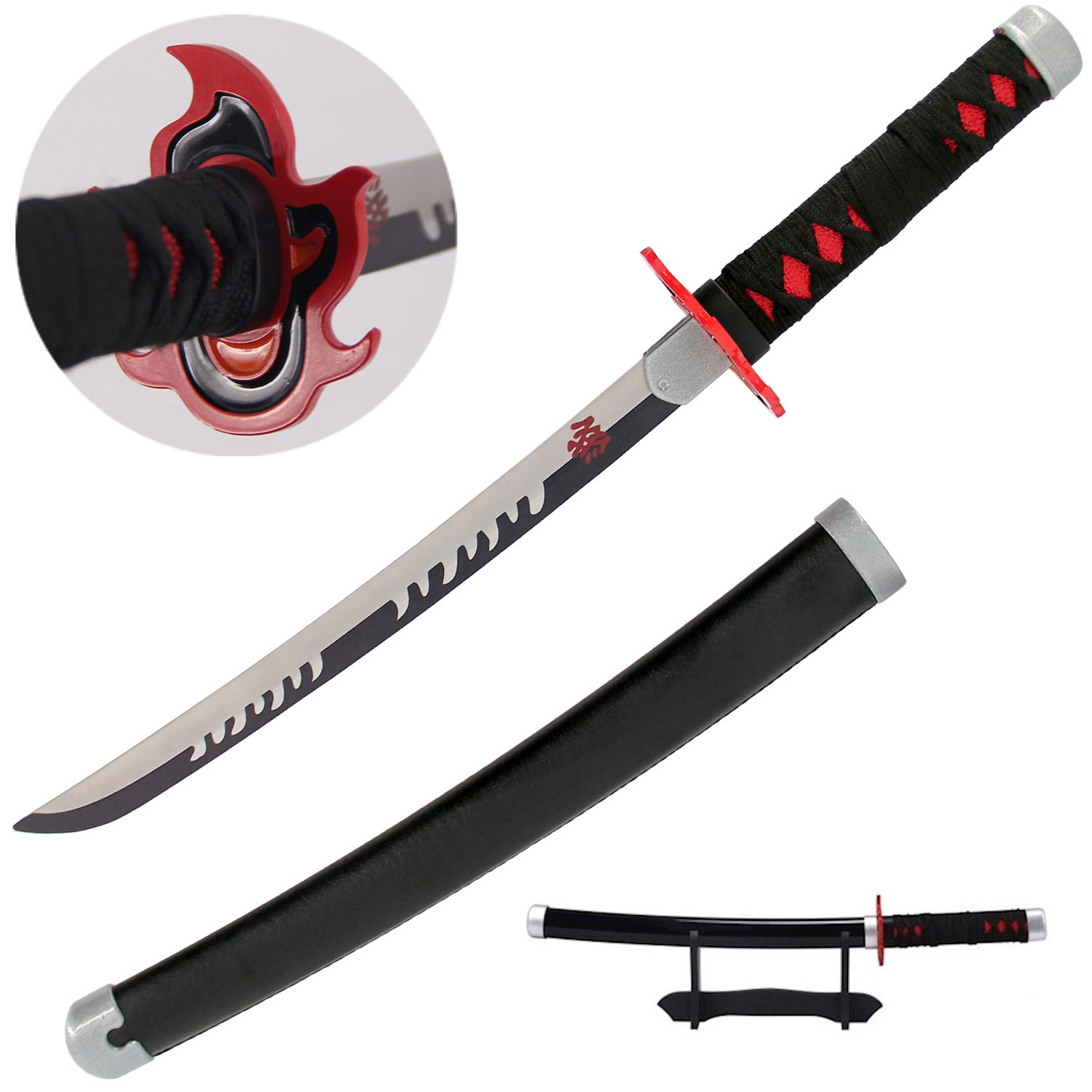 Our carefully crafted real sword is inspired by Tanjiro’s katana, including the colored stainless steel blade (toshin) and its iconic shaped guard (tsuba). This metal replica of the Tanjiro katana is 15.5 inches long and comes with a sheath (saya) and a ABS display stand. The blade is blunted and an ideal home decoration or cosplay photoshoot accessory.